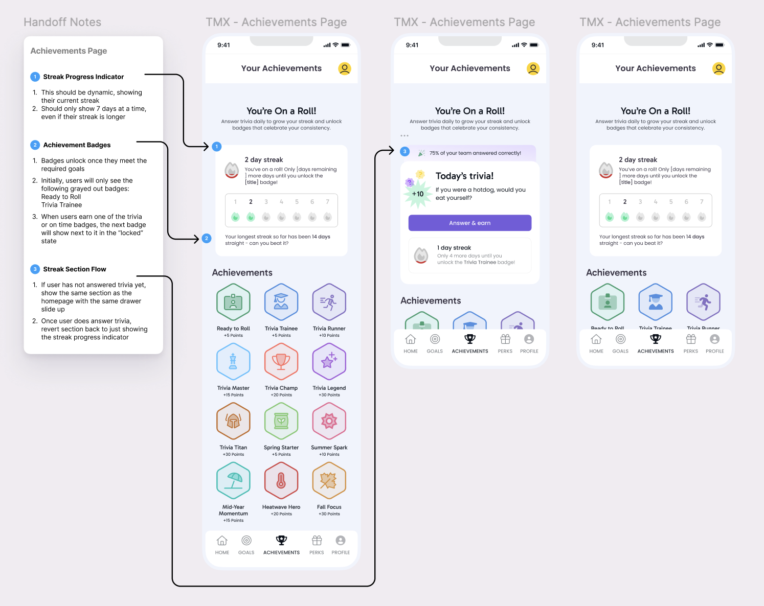 As the Senior Product Designer, I led the concept and design of TMX’s first gamification feature: Achievements and Streaks. Working closely with product management and engineering, I created a system that introduced streaks, badges, and milestones tied to trivia participation and engagement. My focus was on making the experience feel rewarding and intuitive while staying aligned with our broader business goals of increasing satisfaction and retention.